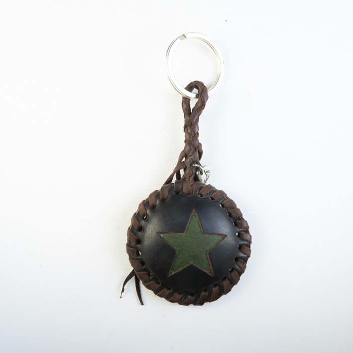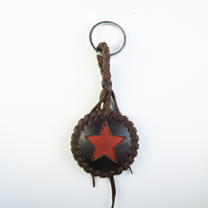 Llavero de cuero artesanal, con una base de 1 mm de espesor calada en forma de estrella y con fondo de cuero rojo, en su interior lleva una esponja para que tenga un tacto mullido, cosido en toda su circunferencia con tira de cuero de 1mm, con un trenzado de cuatro tientos en redondo, para sujetar la anilla metálica sujeta llaves, la estrella roja de cinco puntas a lo largo de la historia, fue utilizada por ornamentos, emblemas, banderas o logotipos, con propósitos muy variados, es por eso que no podía faltar entre nuestros diseños, todos los metales que utilizamos son de zamak bañados con 10 micras de plata, para evitar alergias a ciertos metales y aumentar la durabilidad y calidad del producto.