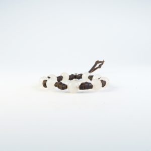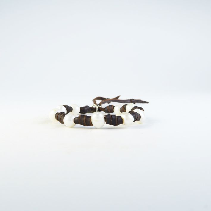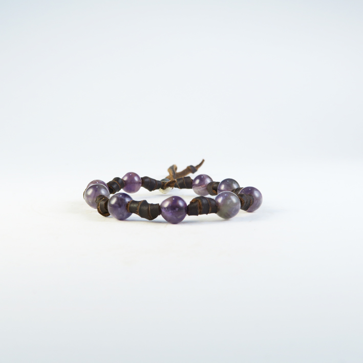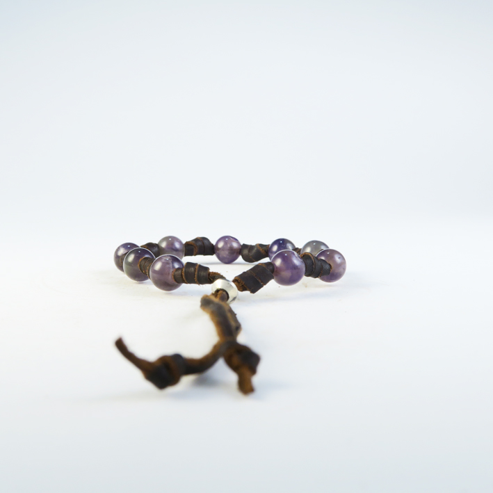 Pulsera de cuero artesanal y  piedra Amatista, realizada con cuero de curtido vegetal, realizada  en todo su longitud con una tira de cuero de 1 mm de espesor, hemos intercalado nudos realizados con el mismo cuero, para que se aprecie el cuero entre las delicadas piedras, generando un equilibrio entro lo rústico y la calidad de los minerales, lleva un cierre de bola metálica que le permite quitar y poner de una forma muy sencilla,  todos los metales que utilizamos son de zamak bañados con 10 micras de plata, para evitar alergias a ciertos metales y aumentar la durabilidad y calidad del producto.