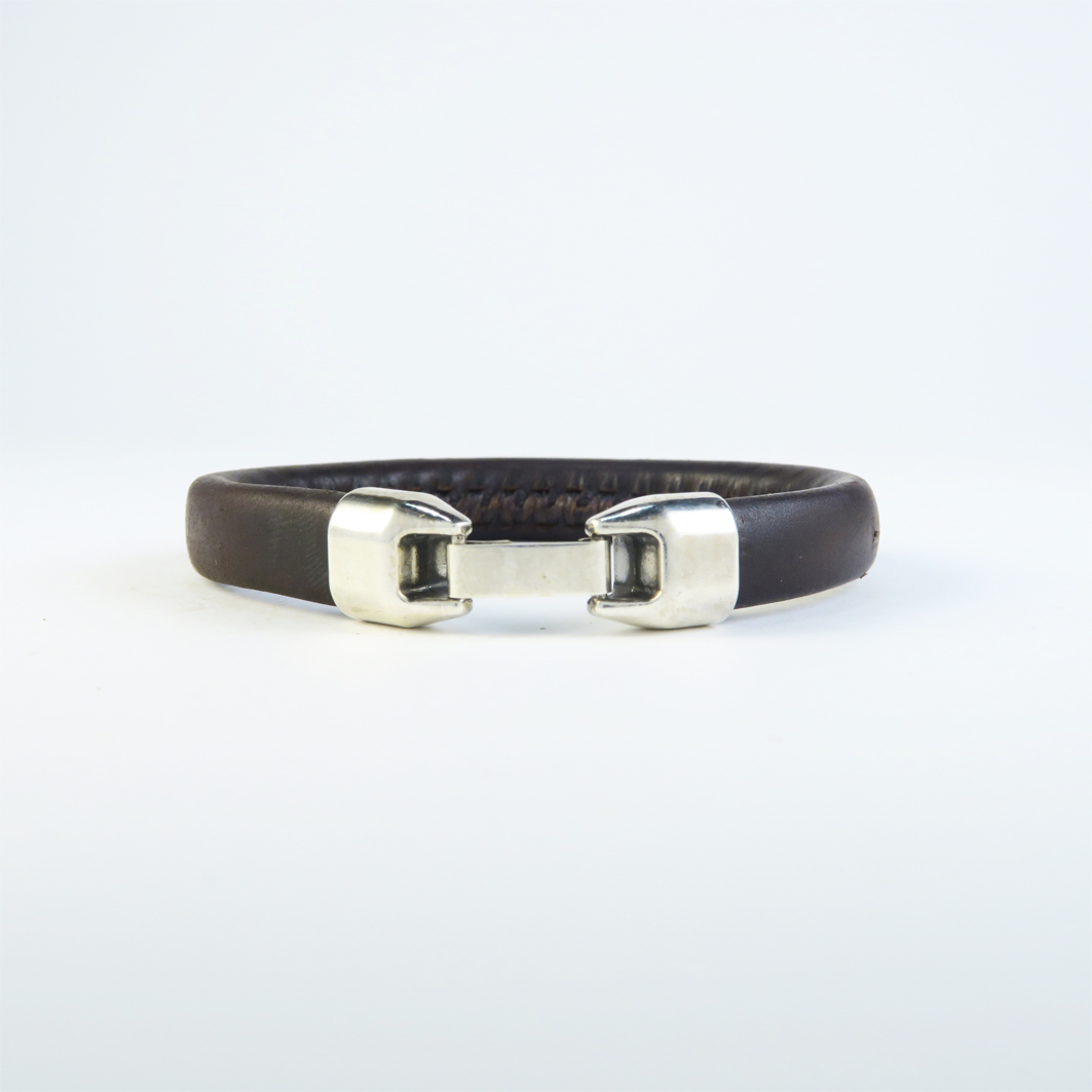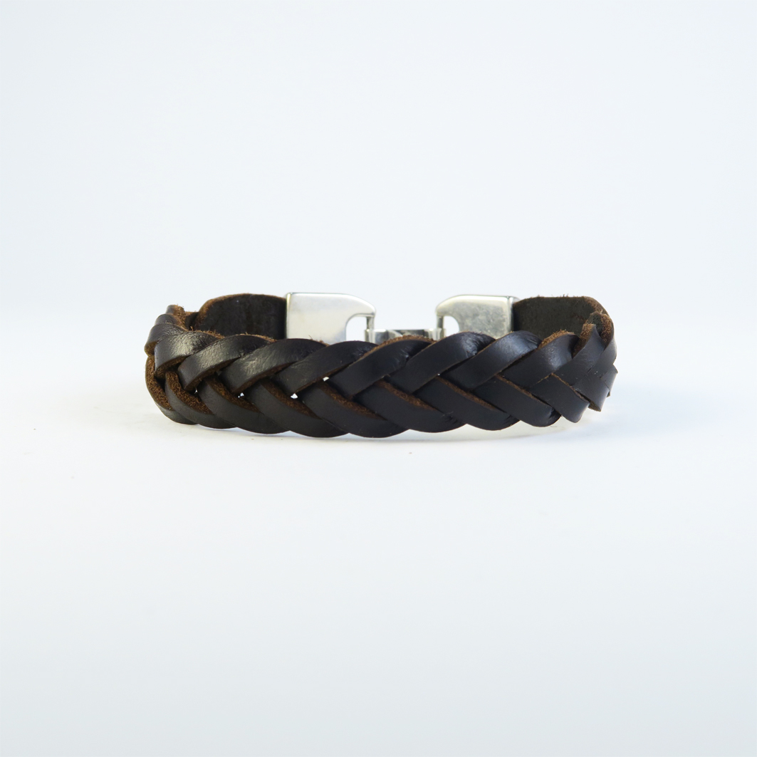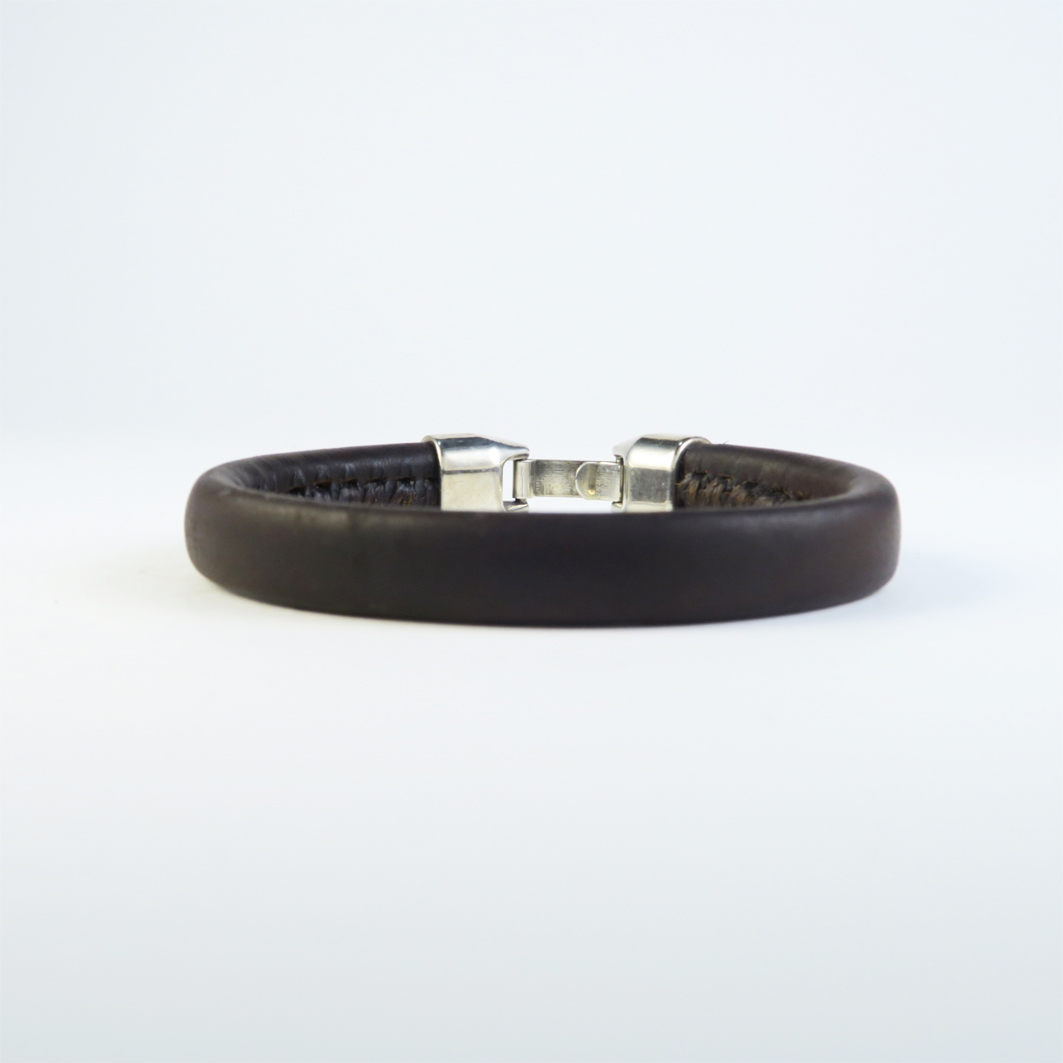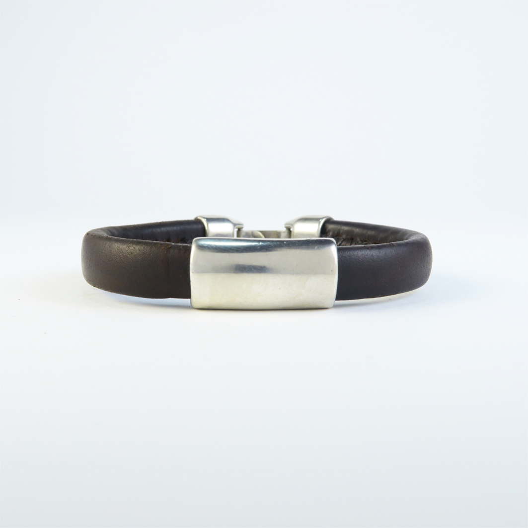 Pulsera de cuero artesanal, con un ancho aprox. de 10 mm, realizada con cuero de curtido vegetal con una base interna de cuero macizo de 10 mm, forrada con un cuero fino cuero de 0,8 mm cosida en su interior con hilo encerado de gran resistencia, lleva un cierre de seguridad que le permite quitar y poner de una forma muy sencilla, una pulsera robusta, resistente y que se adapta perfectamente a la muñeca, todos los metales que utilizamos son de zamak bañados con 10 micras de plata, para evitar alergias a ciertos metales y aumentar la durabilidad y calidad del producto.