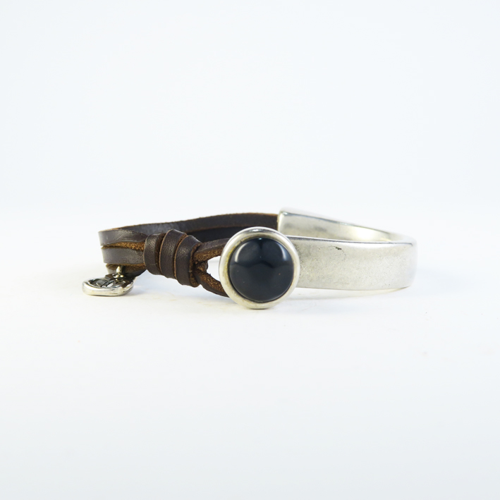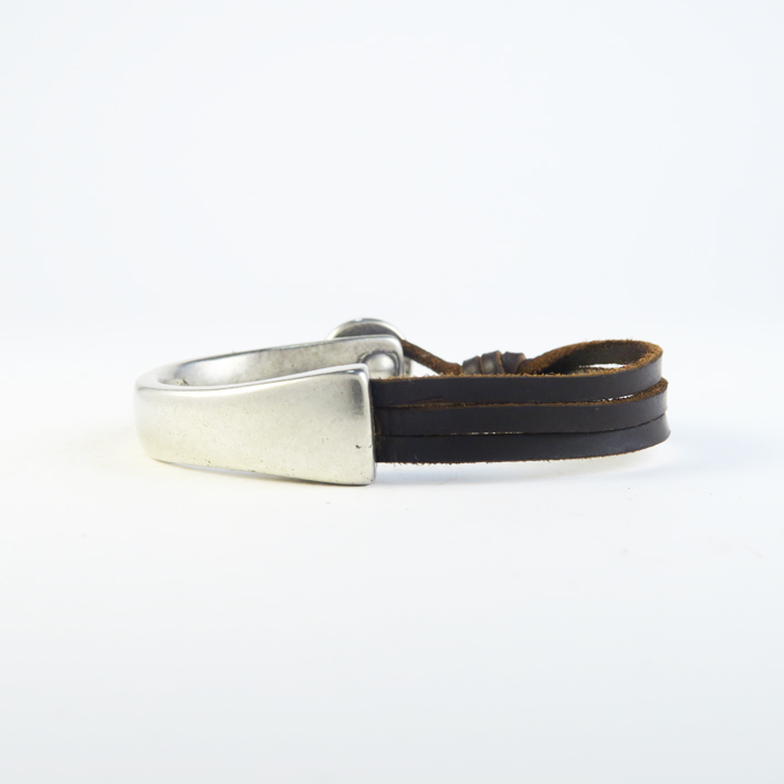 Esta es una pulsera con una elegante pieza de diseño rígida, que se adaptara perfectamente a la mitad de tu muñeca, del otro lado se combina con 3 tiras de cuero dándole ese toque rustico y moderno, un diseño elegante para cualquier ocasión.
