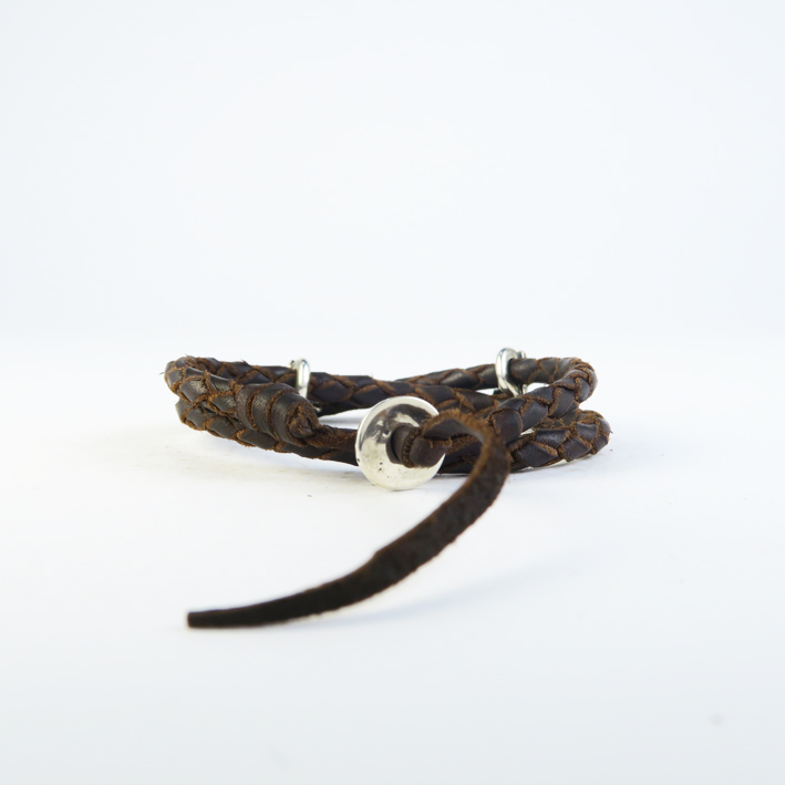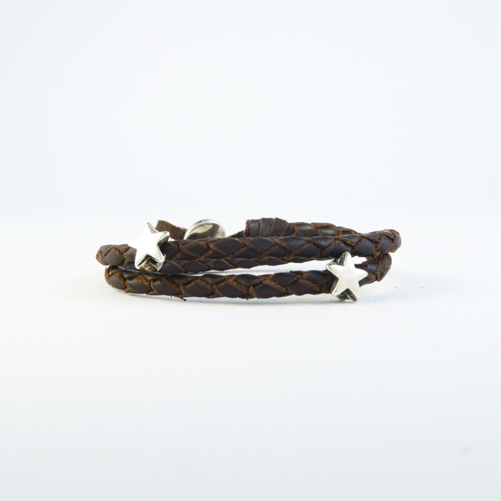 Pulsera de cuero artesanal,  con un ancho aprox. de 5 mm, fabricado con cuero de curtido vegetal, realizada en todo su longitud con cuatro tiras de cuero de 1 mm de espesor formando una trenza redonda, las piezas decorativas en forma de estrella la hacen un modelo moderno y atractivo para los jóvenes, lleva un cierre de tiras ajustable que le permite quitar y poner de una forma muy sencilla, todos los metales que utilizamos son de zamak bañados con 10 micras de plata, para evitar alergias a ciertos metales y aumentar la durabilidad y calidad del producto.