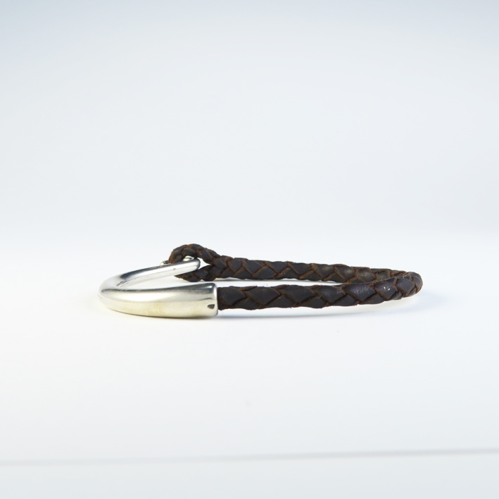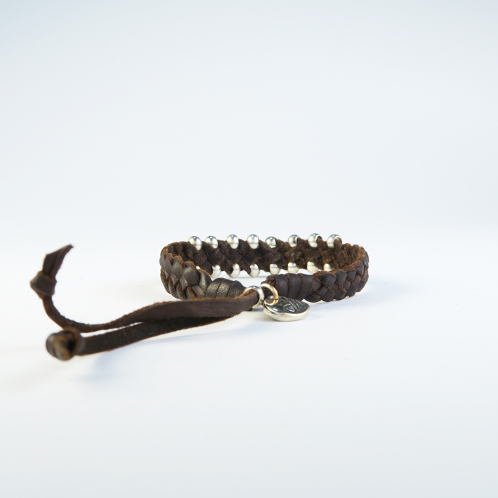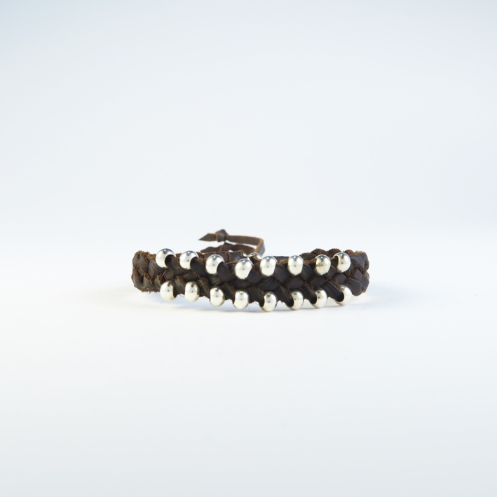 Pulsera de cuero artesanal, realizada con cuero de curtido vegetal, realizada en todo su longitud con cuero de 1 mm de espesor, en forma de trenza de cuatro tiras en plano, lleva engarzadas en las tiras bolas metálicas decorativas, este es un modelo ajustable, su cierre de bola metálica le permite quitar y poner de una forma muy sencilla, todos los metales que utilizamos son de zamak bañados con 10 micras de plata, para evitar alergias a ciertos metales y aumentar la durabilidad y calidad del producto.